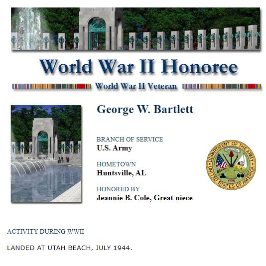 Finalment a la National WWII Memòrial va trobar que George W. Bartlett havia desembarcat a la platja de Utah, a Normandia el mes de juliol de 1944.