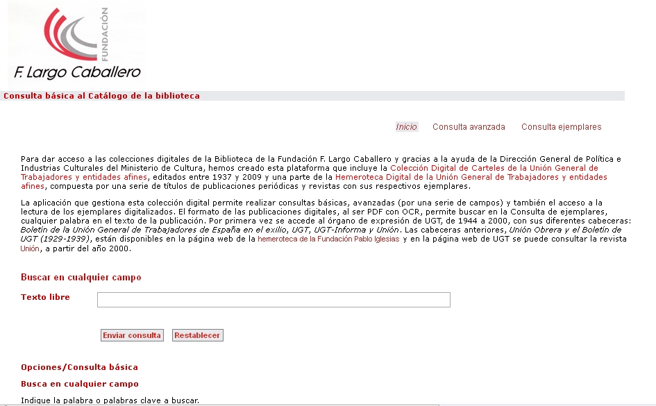L’any 2009, amb l’ajut de la Dirección General de Política e Indústrias Culturales del Ministerio de Cultura, es va crear un catàleg en línia per donar accés a les col·leccions digitals de la biblioteca. En aquesta primera fase es podia accedir a la col·lecció digital de Carteles de la Unión General de Trabajadores y entidades afines editats entre l’any 1937 i el 2009.