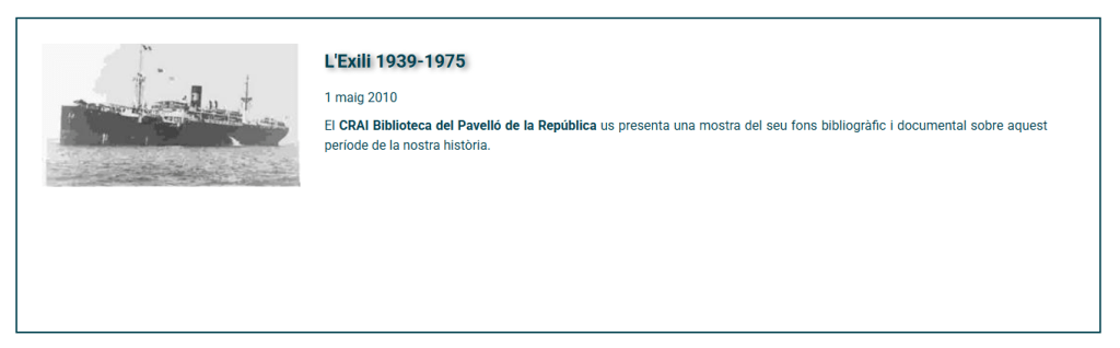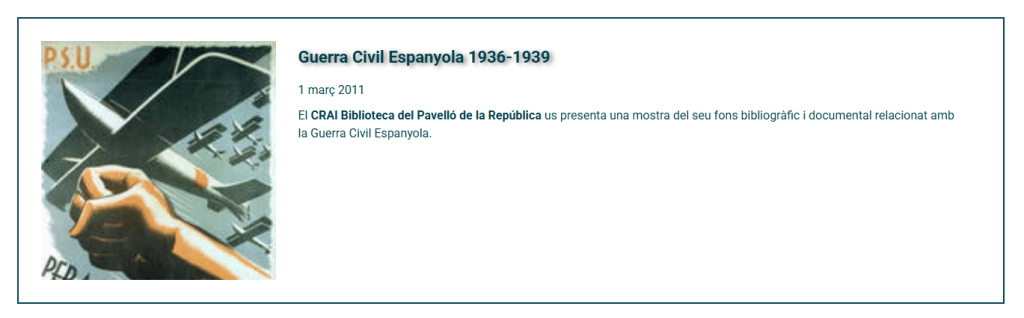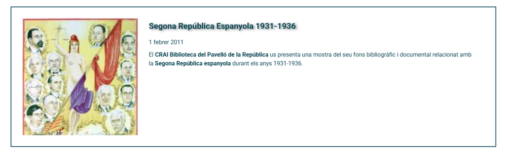 Dins aquest marc de millora, des del CRAI Biblioteca del Pavelló de la República hem adaptat també la nostra pròpia pàgina i, sobretot, els nostres recursos web amb reculls temàtics que són una eina molt valuosa per a iniciar recerques relacionades amb les temàtiques de la biblioteca. Us recordem que s’actualitzen periòdicament, sobretot pel que fa a la inclusió de noves publicacions periòdiques i bibliografia en general.